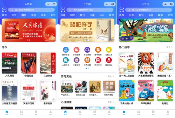 “e齐阅”全民阅读小程序为读者精选3100余种优质期刊,涵盖时政、财经、文学、时尚、科普、健康等日常生活的方方面面。同时,小程序专设听书模块,30余种分类共计70000余集,无论是居家、旅途,还是通勤路上,一键登录即选即听。少儿绘本的加入也为低龄读者提供了丰富而灵动的服务,包括自我成长、艺术启蒙、语言文化等分类,共计1000余部。