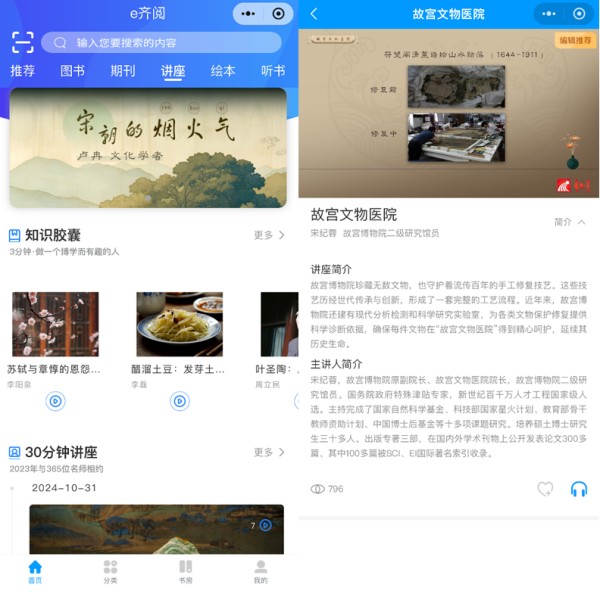 “e齐阅”全民阅读小程序为读者提供10000余集的学术视频,由国内外知名学者、教授独家录制完成,包括每日一讲、知识胶囊、30分钟讲堂、名师汇等,让大众与专家学者面对面,便捷收获新鲜、丰富的专业知识。