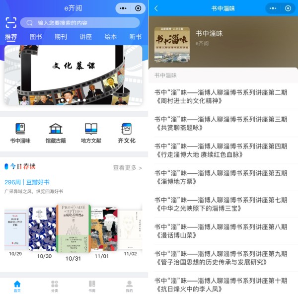 “e齐阅”全民阅读小程序与众不同,集成、植入了淄博优质特色文化资源,已加入“书中淄味”系列文化讲座、“馆藏古籍”“地方文献”“齐文化”相关著作等等,致力打造一个体现淄博特色文化,服务淄博全民阅读的移动阅读平台。