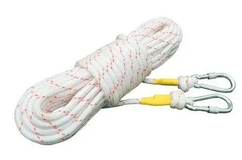 这“一大团绳索”叫作应急逃生绳,它是一种可以用于自救、救人或者转移财物的绳索工具,是经过阻燃处理的,内含军用航空钢丝,绳子两端带钢挂钩。在使用时,将一端绑在柱子、栏杆等牢固的地方,可以沿墙面下降到安全的地方。