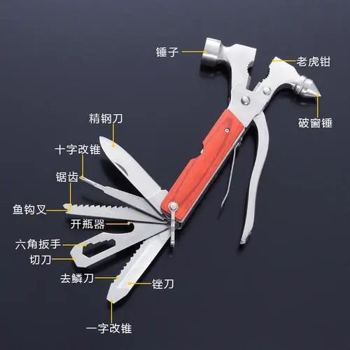 别小看这个"锤子”,它是多功能锤形组合工具。当你把它打开就能发现它是一个“万用工具”,它具有锤子、老虎钳、刀、十字改锥、锯子、六角扳手、一字改锥、锉刀等多个功能。