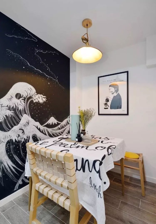 进门的第一个空间就是餐厅,整个空间都不大,设计师做了一面黑色与白色构成的海浪背景墙,搭配木质的餐桌椅,显得简单又时尚。