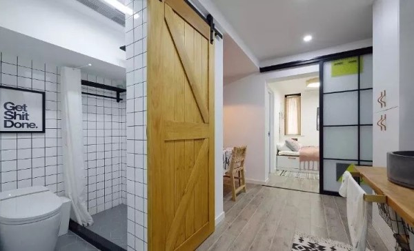 餐厅的边上是通往客厅和主卧的走廊,卫生间就在走廊里面。洗手台被放在了门外,和鞋柜结合起来,整个小空间的布局紧凑而又实用。