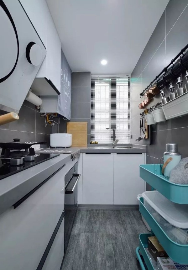 次卧的后面就是厨房了,一个长条形的小空间,L形的橱柜布局方案非常适合小户型,墙面的挂杆、地面的小推车等,给厨房带来了更多的储物空间。
