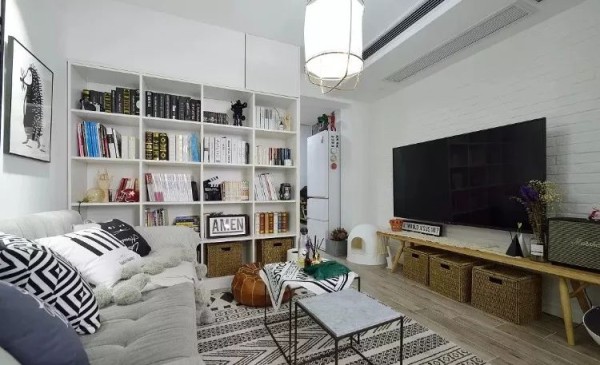 从走廊过来就是客厅空间了,设计师用文化砖做电视背景墙,搭配上沙发边的满墙书架,让客厅看起来很有文艺范。