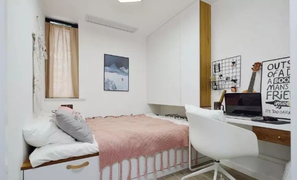 次卧是在入户门的另一侧,设计师做了榻榻米床组合衣柜和书桌的设计,把这个不到6平方的空间,给塞得紧紧的,但软装的搭配却非常好看,有种文艺感。(ps:现在添加微信:qijiavv, 即可根据您家户型,免费提供多套相似VR-3D效果图供作参考!)