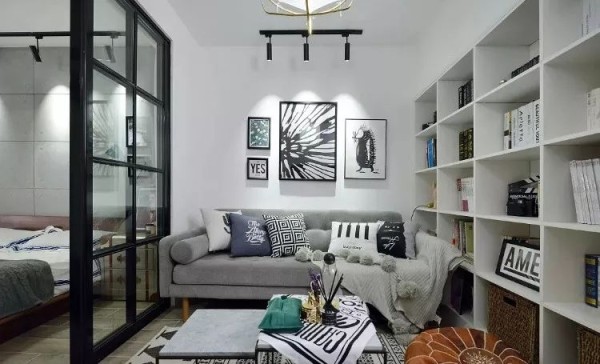 客厅的宽度和长度都不是很长,所以塞下一个双人沙发就好了。加上小茶几和脚凳,也能多坐几个人。客厅和卧室之间用黑框玻璃作为隔断,保证光线流通。