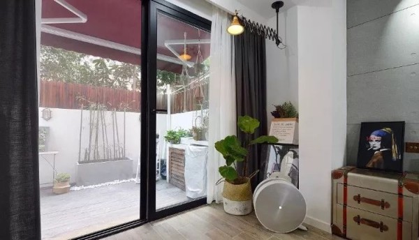 卧室的外面就是一楼的小院子了,同样是用黑框玻璃作为隔断,让光线流通,搭配窗帘又能保证室内的隐私性,屋檐下方是晾晒衣服的地方。