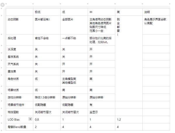 在分级之前,需要确定目标(省电、正常的游戏体验、噱头),我们要在哪一种机型上面运行哪些表现效果和功能,达到怎样的性能目标(帧数FPS、内存占用、Drawcall、同屏三角面数等)。