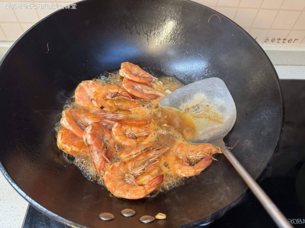 3,然后倒入洗干净的大虾,中小火把大虾煎香。