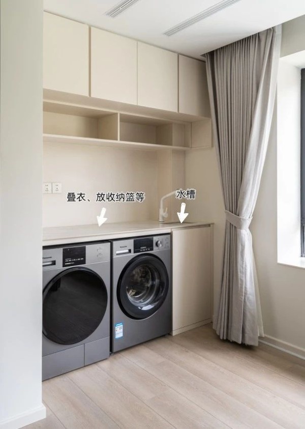 中间留空为洗衣区,内嵌水槽方便清洗小件衣物。左侧的台面不管是用于叠衣还是放收纳篮等等,都功能性多多。