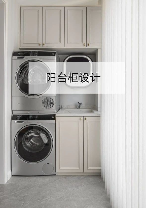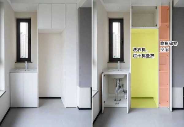 当然考虑到有些人家的阳台尺寸较窄,其实也可以考虑将洗烘套装叠放,如下图,左为洗衣池,右侧为内嵌的洗烘套装,剩余空间则被打造成隐形储物空间,不浪费家中每一平米。