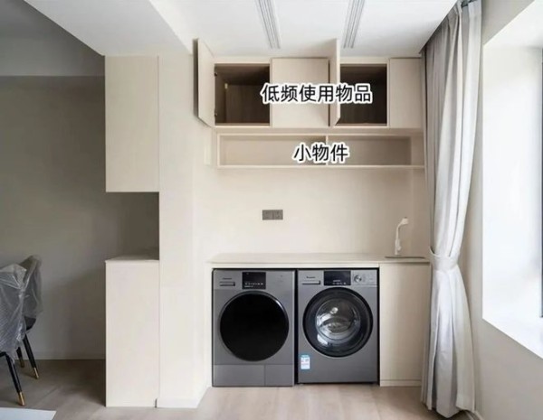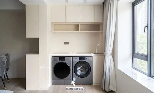 底部洗衣机、烘干机则选择并排放,长1.2m,高90cm,将洗烘套装往里一塞,不落灰不占地,同时洗衣使用也很方便。