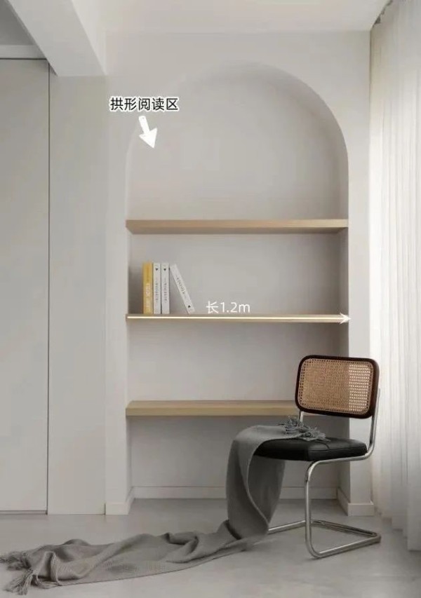 整个阅读区被打造成圆拱形,复古气息扑面而来。居中壁挂3排隔板(长1.2m),搭配灯带,书籍摆放上去,放张凳子在这阅读、喝茶,十分悠然惬意。