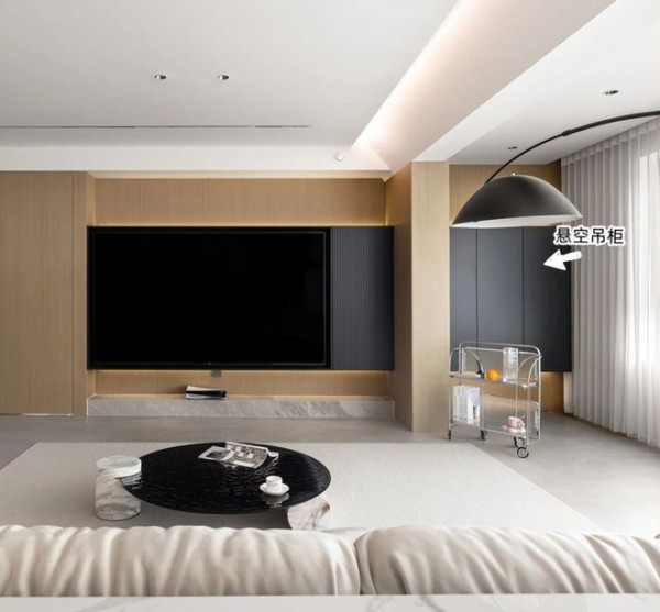 像是下面这位业主家,客厅与阳台打通,电视墙铺装木饰面并延伸至阳台,扑面而来的温馨感。阳台空间也没浪费,而是选择在这定制一组黑色混油悬空吊柜,长、高皆为1.3m,撞色设计不仅让人眼前一亮,用于储物实用性也是满分。