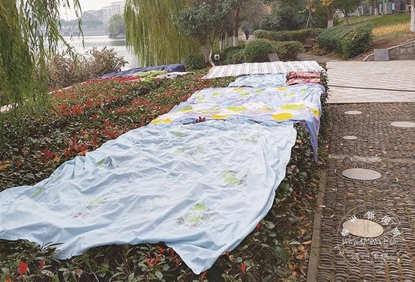除了小区内公园,城市公园也存在不文明晾晒行为。在剡湖旁,记者远远望去,一片灌木林上花花绿绿的特别惹眼。走近发现,灌木林上面盖着好几张床单,与周围的绿化格格不入,很不雅观(图三)。