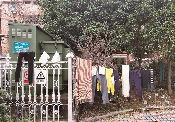 图二 在相公殿社区内公园一角,记者看到,一些居民用绳子在树木之间架起了自制“晾衣架”,树旁的健身器件也被充分利用,挂上了衣物(图一)。这样的简易衣架虽然看似方便,但在衣物的重压下,日积月累,树枝就会多出一道道勒痕。公园的另一侧,本是为居民安全着想,用来隔离高压变电箱的防护栏也被居民用来晾晒衣物,有被用来架“晾衣架”的,也有直接把衣物放在防护栏上的,五颜六色、款式各异的衣物,成了小区公园里一道另类“风景”(图二)。