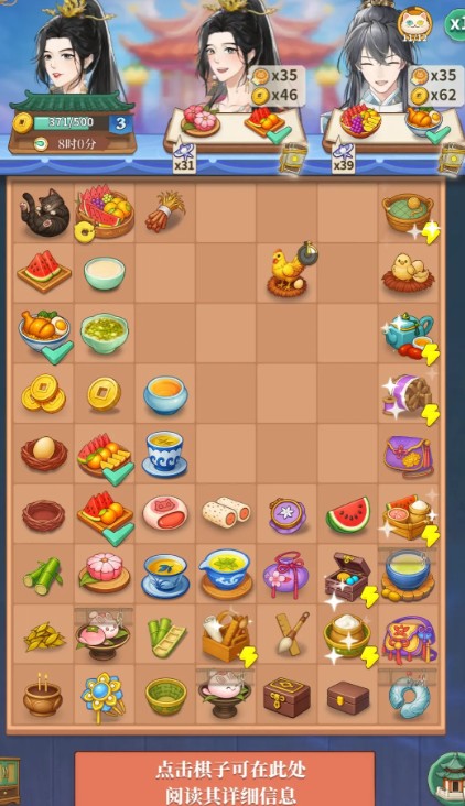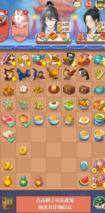 《梦幻消除战》采用三消作为核心操作模式,玩家需通过交换相邻物品的位置,如玉佩、竹简等,将三个及以上相同图标连成一线,进而触发消除效果。每种道具在消除后会提供不同的增益效果,比如消除面点类图标时,有几率恢复角色体力值,或获取茶楼经营所需的菜谱线索。