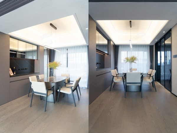 餐厅延续了客厅的色调与材质,全屋定制简约而不失细节。当光影介入其中,场域情态便不再孤单。绿植诗意与烟火温情,让客厅、过道、餐厅自然形成一体。花香与美食交织,让每一次聚餐都成为一场感官的享受。