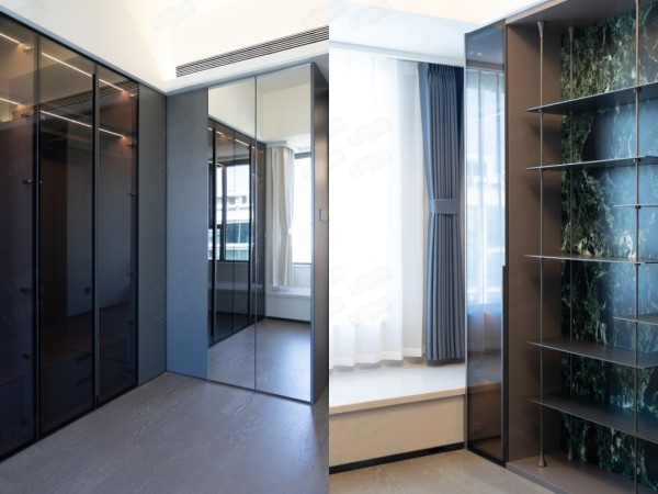 卧室衣帽间由木质、石材、玻璃等元素共同构成,全屋定制空间布局合理、收纳有序,通过材质与结构搭配设计,在视觉上繁衍个性,在精神上悦纳自我。