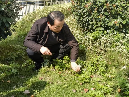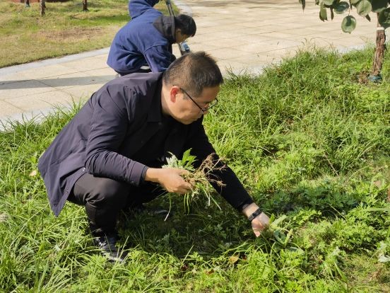 杨弋戈主任则穿梭在绿植丛与草坪交界处,不仅俯身拔除藏在低处的杂草,还顺手将学生夹不起来的细小垃圾徒手清理干净,时不时提醒大家 “注意脚下,别把草坪踩实了,影响草的生长”。