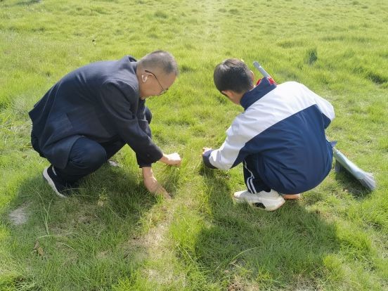身旁的张伟副校长手法娴熟,一手按住草坪植被根部,一手顺着草根轻轻拨弄,将缠绕在草坪里的杂草连根拔除,还不时叮嘱身边学生 “认准杂草的样子,别把咱们的草坪植被带起来”。
