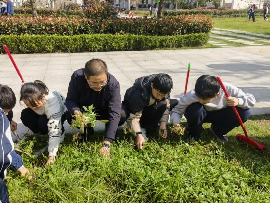 活动现场,张彦广校长率先俯身,小心翼翼地为作物拔除杂草,指尖轻捻、动作细致,生怕碰损娇嫩的幼苗;遇到隐藏在绿植缝隙间的碎纸屑、塑料袋,他便弯腰拿起垃圾夹,循着角落逐一捡拾,不放过任何一处卫生死角。