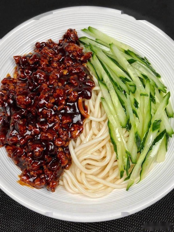 准备食材:面条、黄瓜、肉末、黄豆酱、甜面酱、葱、姜、蒜。