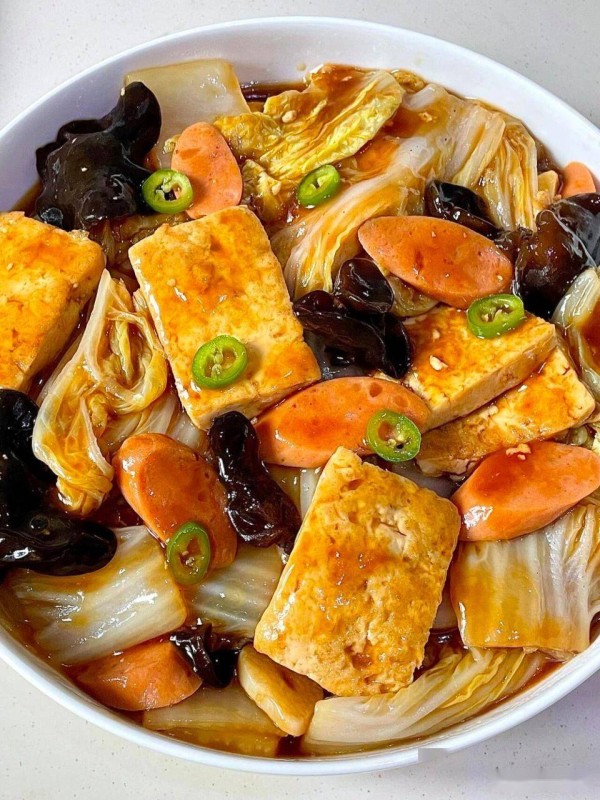 1、准备一块大豆腐切成块,木耳少许提前泡发好,白菜半棵,清洗干净后切成段,牛肉肠切成片备用。