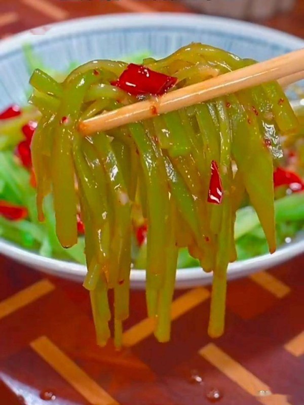 1、准备一根莴笋,去皮洗净后改刀切成丝。放入清水中,加入1勺白醋,浸泡10分钟,捞出控干水分,放入碗中。