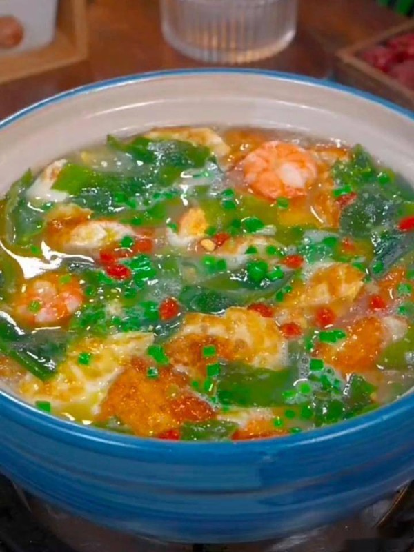 准备食材:大豆腐、鸡蛋、裙带菜、虾仁、枸杞、葱姜蒜。