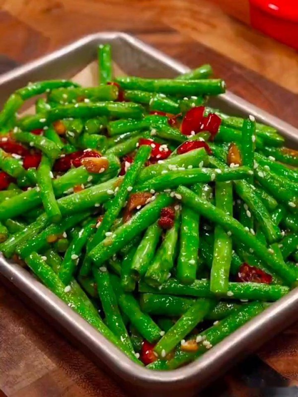 3、放入豆角,加入1勺盐、1勺鸡粉、少许白糖、1勺生抽,大火翻炒均匀,最后撒上芝麻即可出锅。
