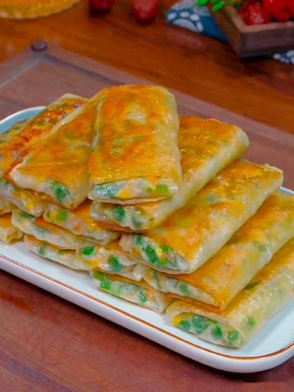 3、准备四张手抓饼,煎至两面金黄酥脆,刷上调好酱料,撒上芝麻和葱花,切小块即可。