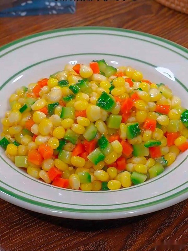 2、起锅烧水,加入1勺盐、1勺食用油,放入玉米粒和胡萝卜丁,焯烫2分钟后放入黄瓜,焯烫30秒捞出。