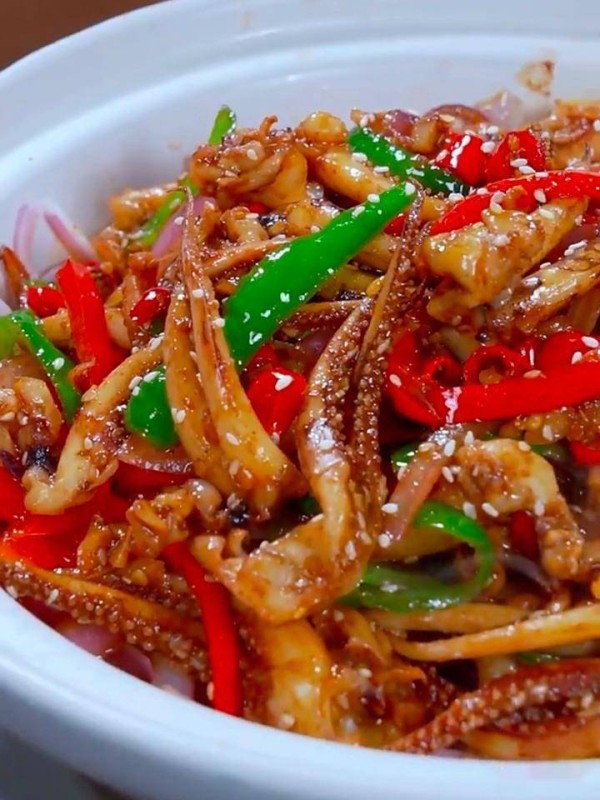 准备食材:鱿鱼、洋葱、小米辣、青红椒、芝麻、孜然粉、葱姜蒜。