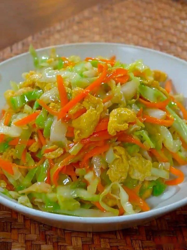 2、起锅烧油,油热倒入鸡蛋液,炒熟炒散,盛出。锅留底油,放入葱花、蒜末,炒出香味,下入包菜丝和胡萝卜丝,大火炒至断生。