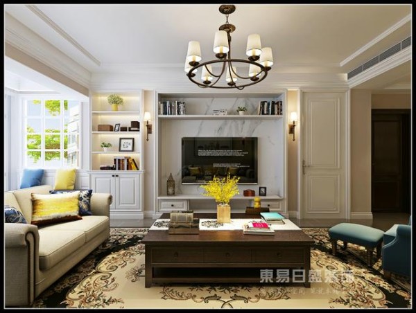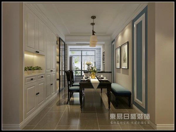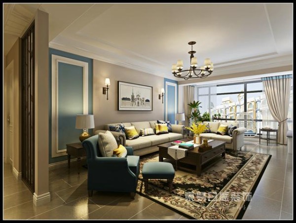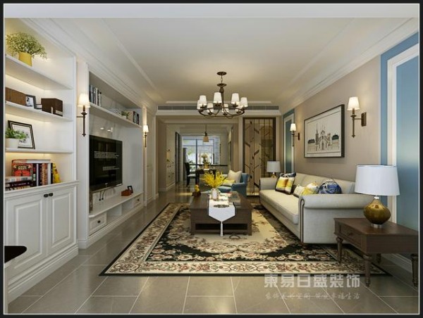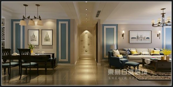 简约美式风格,其色彩相对传统美式更加丰富,更加年轻化,在家具选择上也更加具有包容性。本案设计中,采用简约美式风格营造,居住色彩格调比较丰富,相对于欧式风格来说,它少了一些繁杂的装饰,整体既不失温馨自然的格调,同时彰显业主的优雅精致品味。本案例在最优化功能的情况下较大限度的提升的客厅的开阔性,客厅空间宽敞明亮,沙发简单素雅,客厅地面通铺偏冷调的地砖,搭配暖色乳胶漆墙面,空间光线充足,舒适的同时体现高贵典雅。布局上突出轴线的对称,清新淡雅,明亮舒适的居住空间。点缀在自然中,崇尚冲突之美。更体现简约美式设计之感,创造一个有品质,有品位的家庭环境。