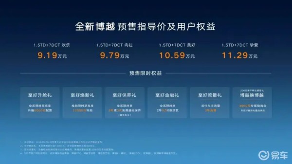 此次预售活动中,全新博越共发布欢乐、向往、美好、挚爱四款车型,预售价从9.19万元到11.29万元。为回馈广大消费者,吉利汽车特别推出“至好升舱礼”、“焕新礼”、“金融礼”、“流量礼”、“保养礼”、“感恩礼”等六大专属权益,其中包含价值最高6000元的免费配置升级、2年5万元零息贷款、最高12000元置换补贴、3年免费流量服务以及基础保养福利。此外,特别关照老博越用户,加赠3000元专属换购金,充分彰显吉利对家庭用户的满满诚意。