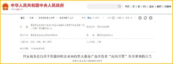 2024年4月24日,国家税务总局发布了《关于资源回收企业向自然人报废产品出售者“反向开票”有关事项的公告》(国家税务总局公告2024年第5号),其中,主要的内容有: