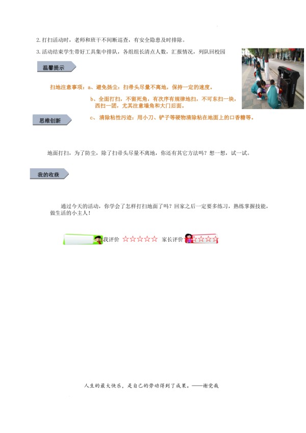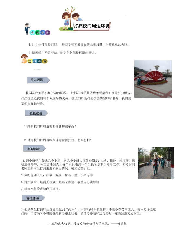 人生的最大快乐,是自己的劳动得到了成果。谢党哉学科网(北京)股份有限公司打扫校门周边环境打扫校门周边环境1.让学生打扫校门口,培养学生养成良好的卫生习惯,不随意意乱丢垃。2.培养学生热爱劳动,树立美化学校环境的意识。校园是我们学习和活动的场所,校园环境的整洁优美要靠我们经常打扫保持。打扫校园是我们每个人应尽的义务。校园门口是我们学校的窗口和名片,我们更要把它打扫干净。1.打扫校门口周边需要准备哪些东西?2.讨论校门口周边哪些地方需要打扫,怎么打扫?1.把全班学生分成几个小组,这几个小组人任务分别是:扫地、拖地、捡垃圾、擦拭墙壁等等,分工责任到人,每个小组指派一个组长负责本组安全工作,并及时向老师汇报本组打扫进度和安全情况。成立检查小组。2.分配劳动工具:扫帚、簸箕、抹布、盆、小铲等等。3.打扫要求:地面无垃圾,角落无积尘,墙壁无污渍等等4.检查小组检查验收并评比。1.要求学生打扫时注意必须做到“两不”:一劳动时不要拥挤,不要争夺劳动工具,更不允许追逐打闹;二劳动时不得随意跑到马路上玩耍,清洁马路边和过马路时一定要注意交通安全。引入话题引入话题活目标 达成活 动 过 程说说议议说说议议组织活动组织活动安全责任安全责任人生的最大快乐,是自己的劳动得到了成果。谢党哉学科网(北京)股份有限公司2.打扫活动时,老师和班干不间断巡查,有安全隐患及时排除。3.活动结束学生带好工具集中排队,各组组长清点人数,汇报情况,列队回校园 扫地注意事项:a、避免扬尘:扫帚头尽量不离地,保持一定的速度。扫地注意事项:a、避免扬尘:扫帚头尽量不离地,保持一定的速度。b、全面打扫,不留死角,有次序有规律地扫,不可东扫一块,b、全面打扫,不留死角,有次序有规律地扫,不可东扫一块,西扫一团,尤其注意墙角和大门后面。西扫一团,尤其注意墙角和大门后面。c、c、清除粘性污迹:用小刀、铲子等硬物清除粘在地面上的口香糖等。清除粘性污迹:用小刀、铲子等硬物清除粘在地面上的口香糖等。地面打扫,为了防尘,除了扫帚头尽量不离地,你还有其它方法吗?想一想,试一试。通过今天的活动,你学会了怎样打扫地面了吗?回家之后一定要多练习,熟练掌握技能,做生活的小主人!自我评价 家长评价温馨提示温馨提示思维创新思维创新医治一切病痛最好的最宝贵的药品,就是劳动。奥斯特洛夫斯基我的收获我的收获人生的最大快乐,是自己的劳动得到了成果。谢党哉学科网(北京)股份有限公司打扫校门周边环境打扫校门周边环境打扫校门周边环境打扫校门周边环境 校园是我们学习和活动校园是我们学习和活动的场所,的场所,校园环境的整洁优校园环境的整洁优美要靠我们经常打扫保持。打美要靠我们经常打扫保持。打扫校园是我们每个人应尽的义扫校园是我们每个人应尽的义务。校园门口是我们学校的窗务。校园门口是我们学校的窗口和名片,我们更要把它打扫口和名片,我们更要把它打扫干净。干净。一、引入话题一、引入话题一一、说说议议说说议议 校门口周边哪些地方需要打扫,怎么打扫?二二、分配任务、分配任务1、把学生分成几个小组,确定每组任务,指派每组组长负责本组安全和汇报进度。2、提出打扫要求。、提出打扫要求。三三、安全要求、安全要求 大家注意必须做到“两不”:一劳动时不要拥挤,不要争夺劳动工具,更不允许追逐打闹;二劳动时不得随意跑到马路上玩耍,清洁马路边和过马路时一定要注意交通安全。四、实践活动四、实践活动 1、学生打扫体验劳动乐趣。2、检查验收评比。五、我的收获五、我的收获 通过今天的劳动你感到快乐了吗?你还有哪些收获?谢 谢!