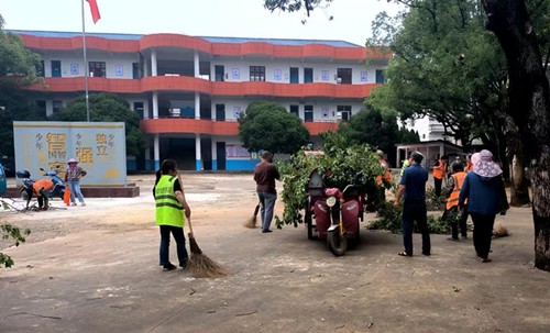 5月25日,余干县信丰中心小学内,十余名信丰垦殖场环卫工人化身“校园美容师”,用辛勤劳动为同学们打造出整洁明亮的学习环境。