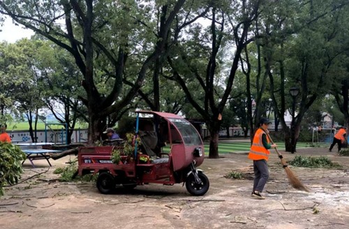 活动现场,环卫工人们分工明确、配合默契。面对已修剪好的枯死树枝,他们迅速组成搬运小队,有的两人一组抬起沉重枝丫,有的负责装车码放,在汗水与吆喝声中,枯枝被高效清运出校。完成搬运任务后,大家手持扫帚、夹子等工具,立即投身校园清扫工作。他们弯腰清理花坛深处的落叶,蹲下捡起墙角的细碎杂物,细致入微地不放过任何卫生死角。经过数小时的忙碌,操场、道路焕然一新。