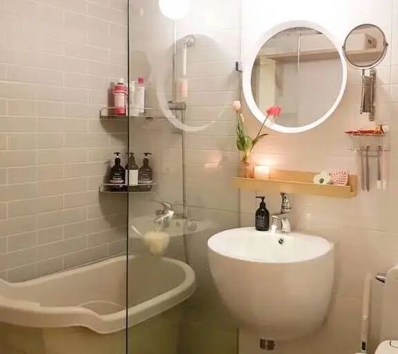 卫生间的布置和装饰,也是非常精致美观。干湿分离的设计,创意感十足,超级实用。美颜效果的镜子,看起来尽显高级感。小而精致的卫生间布置,让人爱上。
