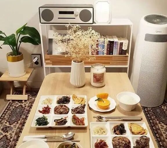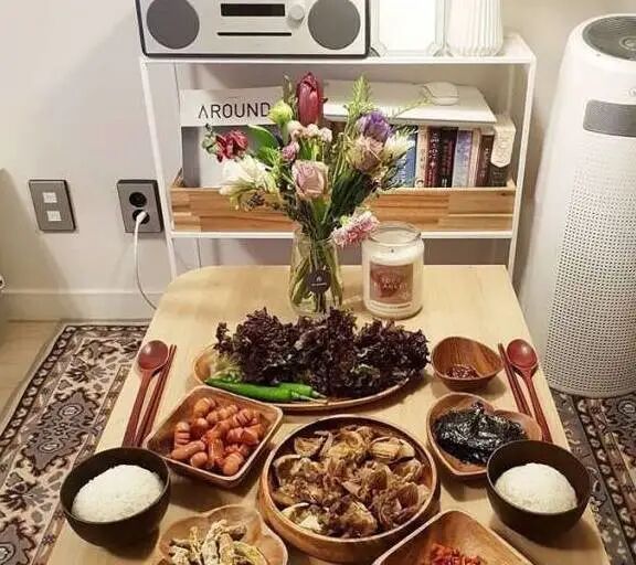 注重仪式感的主妇,总是把饭菜摆放的精致美观,超有仪式感。餐桌上放置着一束鲜花,整个房间都充满着浓郁的花香味。