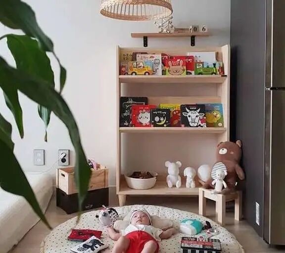 爸爸在带娃的时候,妈妈就会在收拾家务和布置家里,整个家布置得非常甜蜜。客厅的地上铺上一块儿童地毯,将宝宝放在上面,随手一拍都超级好看有没有!