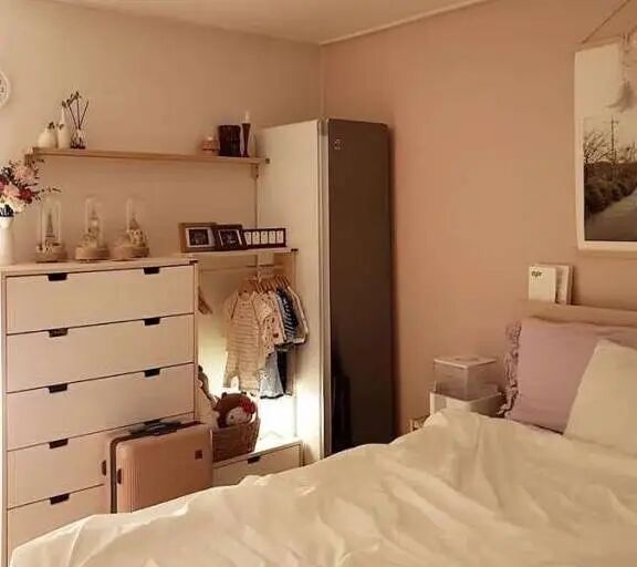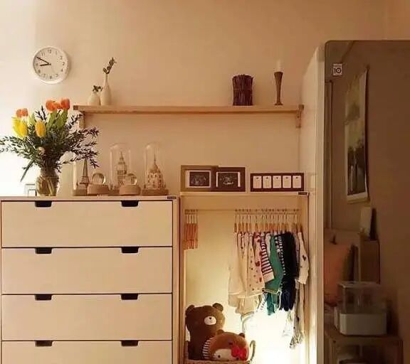 简洁的木质收纳柜,可以容纳一家人的小物件,整齐有序地摆放看着非常用心了。柜子上,用鲜花和物品进行布置,小而精致让人喜欢。简洁利落的木质柜子,挂着宝宝的衣物,存取也十分的方便。