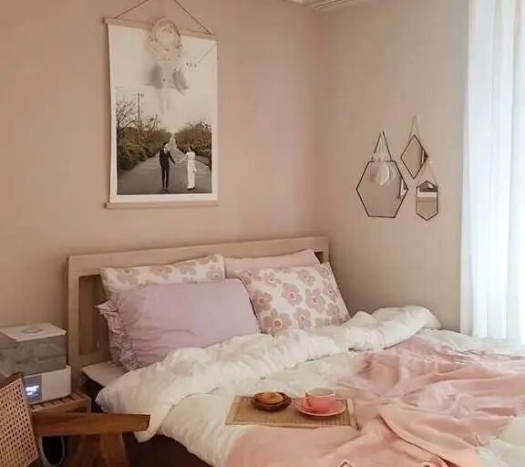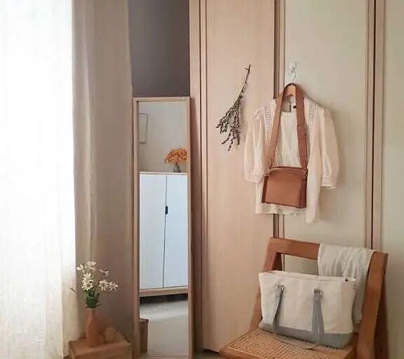 木质的地板和家具相搭配,竟毫无违和感,看着十分高级。木质的编织椅子和全身镜,实用又美观。镜子旁,用花朵进行修饰和布置,整个房间都变得温馨浪漫起来。