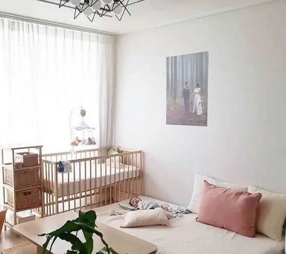 一个不大的客厅,爸爸平时就在客厅里带着宝宝,氛围都变得有爱和甜蜜起来。大大的落地窗配上一个纱帘,显得十分治愈和高级。木质的家具,清新又自然,有种回归大自然的返璞归真。白色极简的沙发,一旁放着木质的婴儿床,方便爸爸日常带娃。