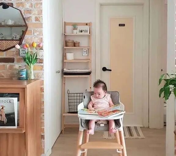 家中清一色的木质家具,看着就非常的治愈人心。妈妈在收拾家务的时候,就把宝宝放在儿童椅上,乖巧的宝宝就坐在椅子上陪伴着。