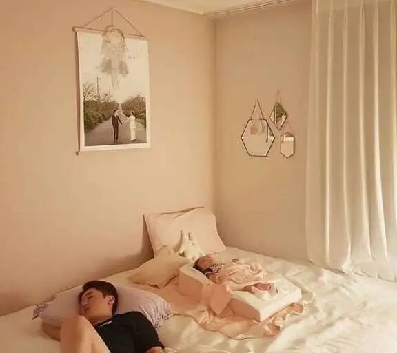 卧室的布置,没有太多的修饰,却显得温馨无比。暖色调的灯光打在屋里,看着就超级治愈和美观。爸爸哄着宝宝睡觉,累了也躺着睡着了。画面十分温馨和谐。